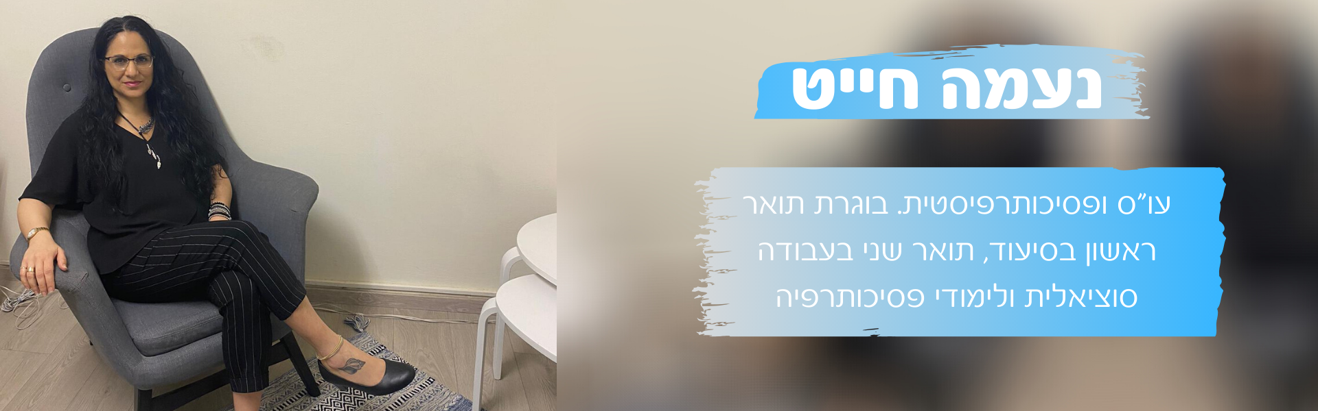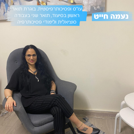אני נעמה חייט, עו"ס ופסיכותרפיסטית. בוגרת אוניברסיטת בן גוריון בנגב - תואר ראשון בסיעוד, תואר שני בעבודה סוציאלית ולימודי פסיכותרפיה. העבודה עם אנשים והשותפות למסע ההתמודדות שלהם, הינם ערכי היסוד המעניקים משמעות לעבודתי.